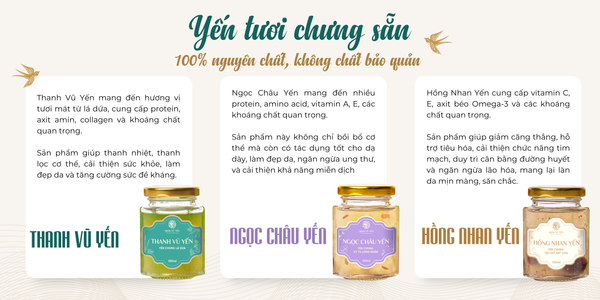 Set yến tươi chưng sẵn là sự lựa chọn hàng đầu cho một món quà sực khỏe dinh dưỡng, tiện lợi. Với thói quen sử dụng đều đặn mỗi ngày một hũ sẽ giúp bạn cùng gia đình sẽ cảm nhận được những thay đổi tích cực rõ rệt cho cơ thể và tinh thần.