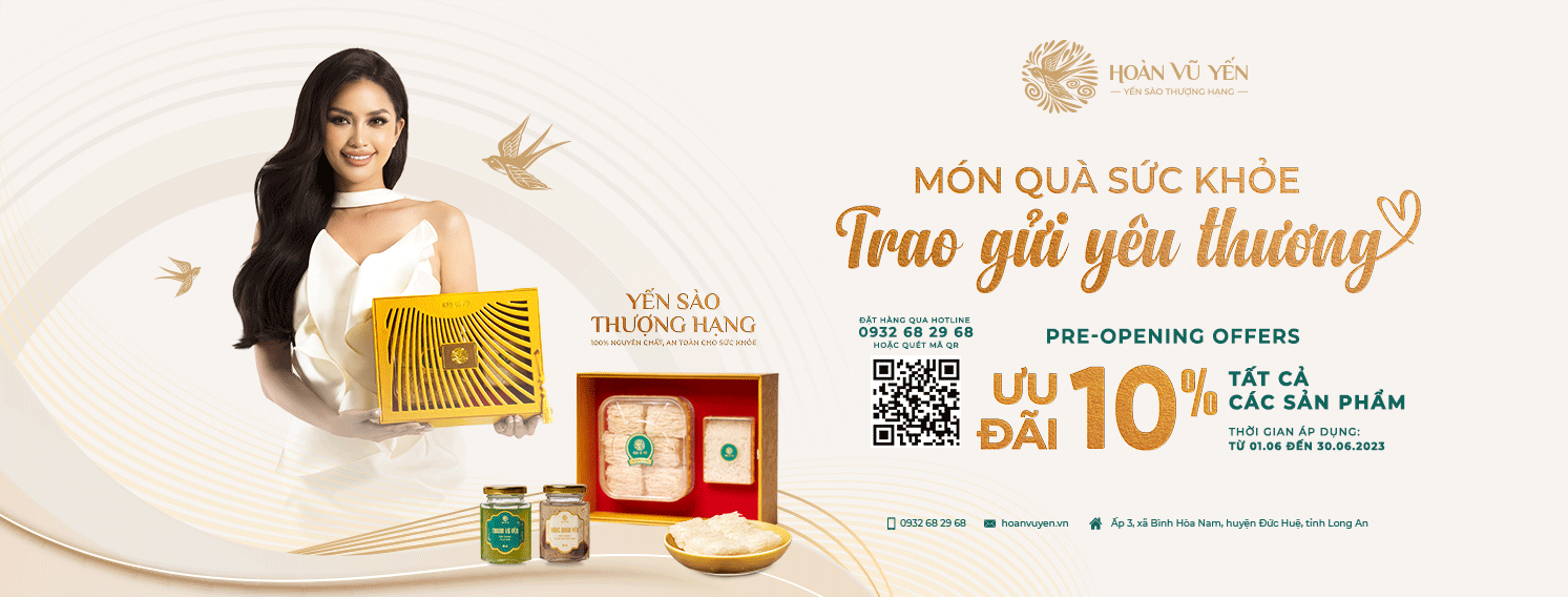 Với mong muốn mang đến những sản phẩm yến sào thượng hạng và tri ân khách hàng nhân dịp chuẩn bị khai trương chính thức, Hoàn Vũ Yến dành tặng quý khách hàng chương trình ưu đãi hấp dẫn “Tặng ngàn ưu đãi – Trao trọn yêu thương”. Theo đó, khi mua sắm các dòng sản phẩm của Hoàn Vũ Yến, khách hàng sẽ được giảm trực tiếp 10% trên tổng hóa đơn không giới hạn số lượng. Ưu đãi áp dụng khi mua online qua website www.hoanvuyen.vn hoặc có thể đặt hàng trực tiếp trên fanpage Hoàn Vũ Yến. Chương trình được áp dụng từ 01/06 – 30/06/2023..
